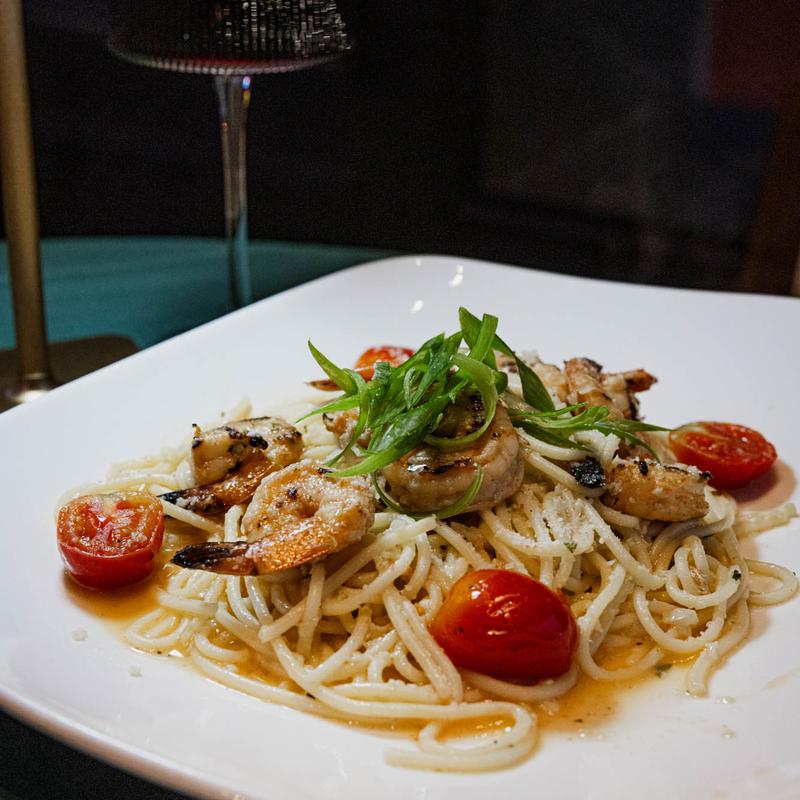 Spaghetti, lemon butter, cherry tomatoes, herb oil and parmesan. With grilled shrimp