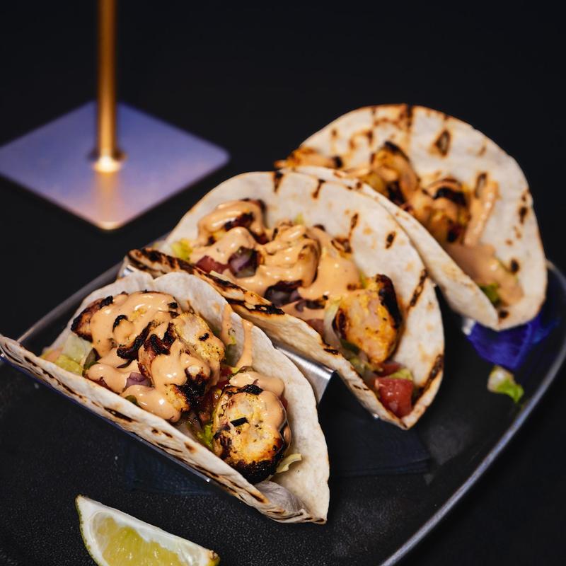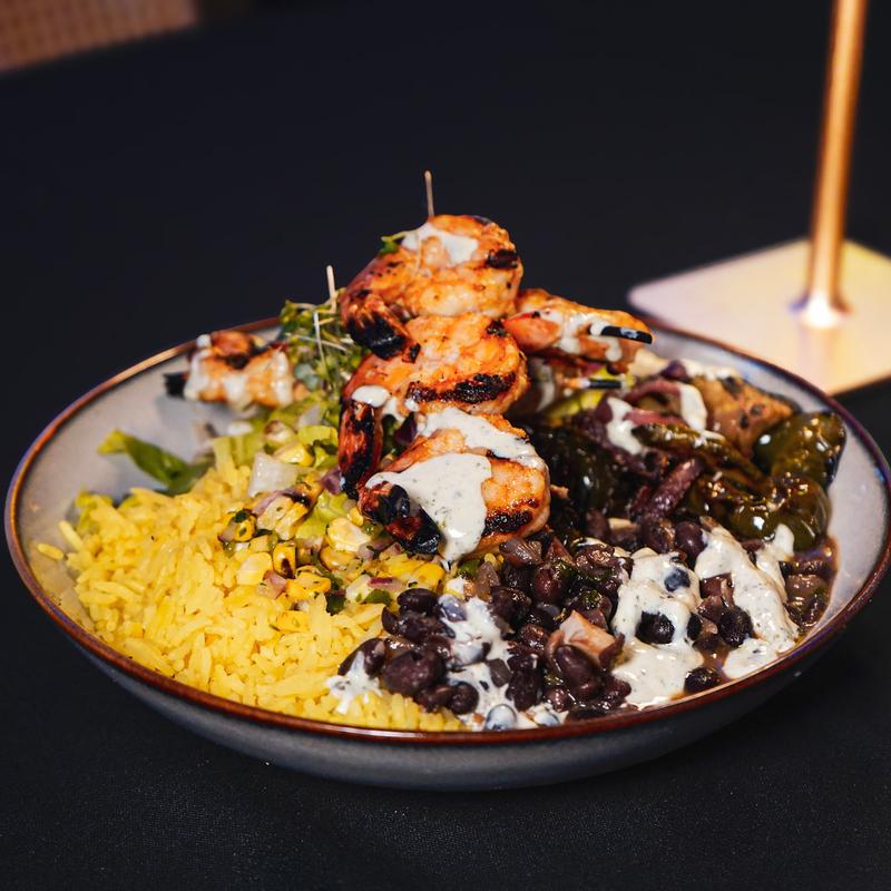 Fragrant saffron rice with roasted corn salsa, black beans, pickled onions, crisp lettuce, grilled seasonal veggies and your choice of protein: