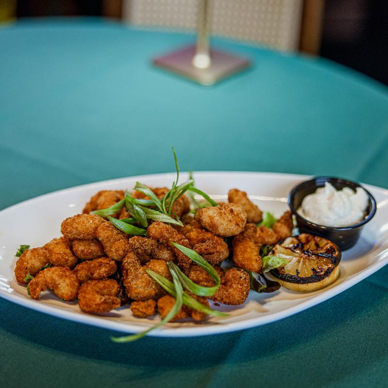 Cajun-spiced buttermilk shrimp with charred lemon aioli and house pickles