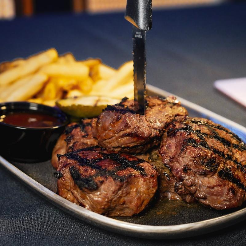 Bourbon marinated Steak tip, seasoned fries and grilled vegetables. Served with a Steak sauce and truffle butter.