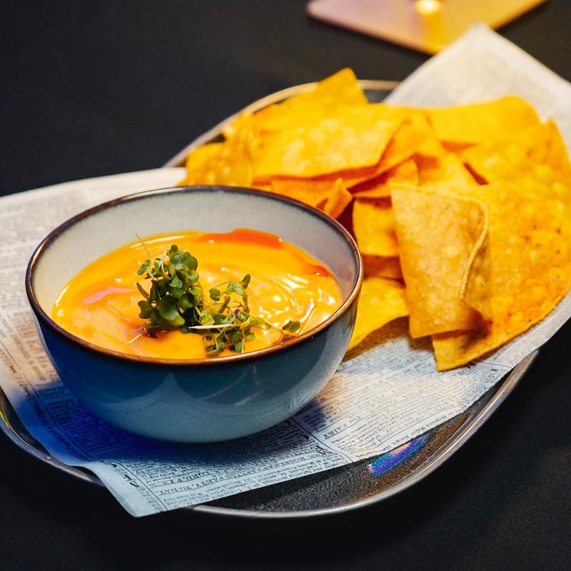 House-spiced tortilla chips with Queso topped with Hot chili oil